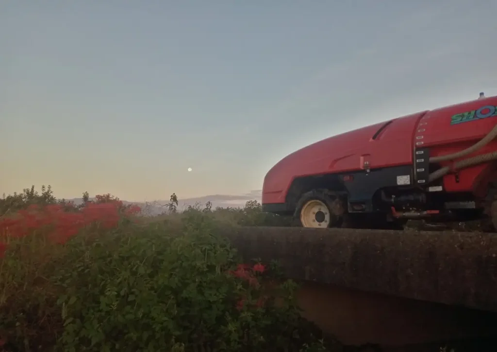 スプレーヤー(農薬散布の機械)と、まあるい月と、彼岸花の組み合わせで写真が撮れました。