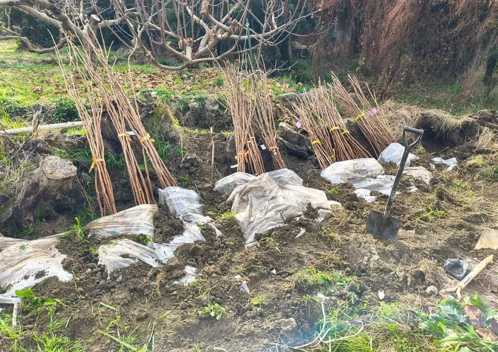 植えるまでに時間があるので、畑の隅に仮植えしておきます。